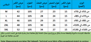 - • ملاحظة: القياسات مأخوذة والقطعة مفرودة، وبفضل المرونة العالية، يفضل اختيار المقاس الأقرب لوزنك الفعلي للحصول على أفضل مظهر "سليم".